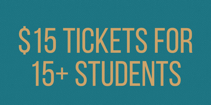 $15 tickets for 15 or more students, plus two free adult tickets, to the same performance.